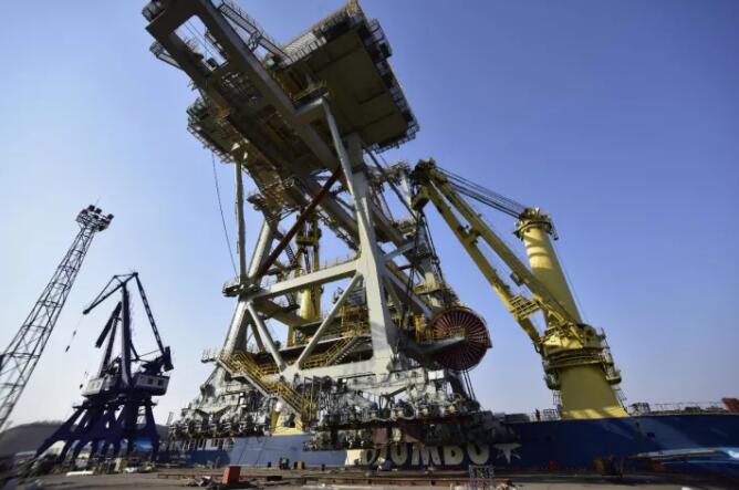 現(xiàn)場工作人員介紹,該設(shè)備長103米,寬31米,高60米,整機由廠家組裝完畢后用駁船運抵我港,在我港裝船運往阿聯(lián)酋。據(jù)悉,該設(shè)備以前運輸通常用駁船,在船與岸壁間鋪設(shè)軌道,通過機械外力使設(shè)備移至駁船上。該方法需要考慮海水潮汐等因素,存在一定的安全風(fēng)險。為確保設(shè)備安全裝船,本次作業(yè)客戶選擇使用兩臺1500噸船吊配合作業(yè),將設(shè)備整機吊裝上船。