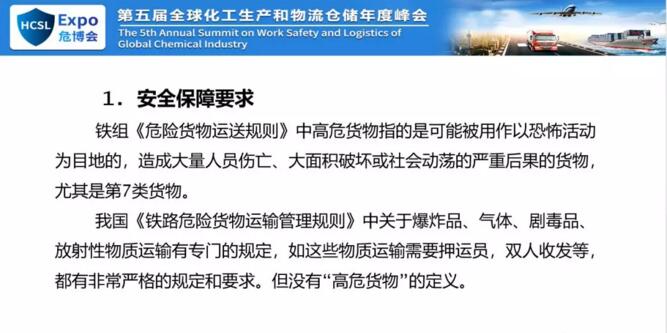 這是我們否它的主要原因,我們認為你不能大量的引用歐盟標準,你可以引用內(nèi)容,因為內(nèi)容可以直接摘過來,但是不能直接引用,直接引用我們沒法執(zhí)行,所以主要原因是在這兒。下面我說一下咱們的規(guī)則,鐵組的危險貨物規(guī)則和國家的鐵路運危險貨物運輸管理規(guī)則。一個是近期我們受到征求意見稿就是叫高危貨物或者高?;瘜W(xué)品,對我們來說高危貨物,但是鐵路的運輸規(guī)則和橘皮書里面早就有高?;瘜W(xué)品,但是我們的域值差別很大。我國鐵路危險貨物運輸管理規(guī)則中有各種爆炸品、氣體、劇毒品、放射性物質(zhì)有專門規(guī)定,但是沒有高危貨物的定義。