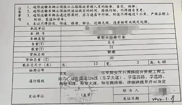 4月7日下午16時,一部運載水泥管的運輸車輛途徑東孚超限運輸檢測站,過磅顯示車貨總重53.65噸,同時該車還存在超高超寬的幾何超限行為。駕駛員拿出一張《福建省超限運輸車輛通行證》,向執(zhí)法人員表示該車已辦理超限運輸許可手續(xù)。