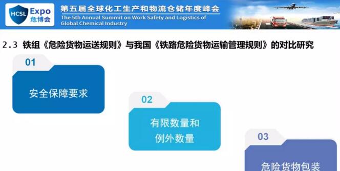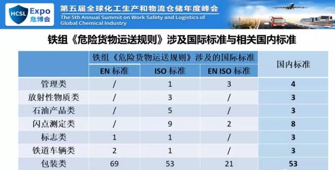 這是我們否它的主要原因,我們認為你不能大量的引用歐盟標準,你可以引用內(nèi)容,因為內(nèi)容可以直接摘過來,但是不能直接引用,直接引用我們沒法執(zhí)行,所以主要原因是在這兒。下面我說一下咱們的規(guī)則,鐵組的危險貨物規(guī)則和國家的鐵路運危險貨物運輸管理規(guī)則。一個是近期我們受到征求意見稿就是叫高危貨物或者高?;瘜W(xué)品,對我們來說高危貨物,但是鐵路的運輸規(guī)則和橘皮書里面早就有高?;瘜W(xué)品,但是我們的域值差別很大。我國鐵路危險貨物運輸管理規(guī)則中有各種爆炸品、氣體、劇毒品、放射性物質(zhì)有專門規(guī)定,但是沒有高危貨物的定義。