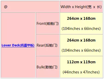 此外注意605cm為20英尺板的長度,如果貨物超過605cm長度,在裝飛機(jī)時需要做預(yù)先準(zhǔn)備和安排,并從鼻(機(jī)頭)門進(jìn)入飛機(jī)貨艙貨物的一般長度限制為1211cm(等于兩個20英尺板相加的長度);超過1211cm的貨物不是不能裝入,但限制高度244CM應(yīng)該需要降低,需要做墊板操作才能裝入貨機(jī)。